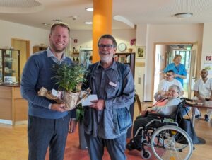 Der Regionalleiter der Seniorenhilfe der Stiftung kreuznacher diakonie, Daniel Shepherd Parker, überbrachte die herzlichsten Grüße der Leiterin des Geschäftsbereiches, Monika Kolling, und überreichte ihm einen Schmetterlingsbaum. „Für mich ist die Zahl von vierzig Dienstjahren unvorstellbar – insbesondere gemessen an meinem Lebensalter von 42 Jahren. Sie gehören damit fast zu einer aussterbenden Spezies, denn so lange Beschäftigungszeiten sind in der heutigen Zeit kaum mehr zu beobachten“, so Parker. Er dankte für das hohe Maß an Identifikation mit der Arbeit für altgewordene Menschen und für die Stiftung kreuznacher diakonie insgesamt. Er sei froh, dass der Einrichtungsleiter immer wieder einen mahnenden Finger hebe, wenn etwas nicht so laufe wie es sollte. Sehr dankbar sei er für das hohe Maß an Kooperation insgesamt. „Schon jetzt mache ich mir Gedanken, dass Sie in einem Jahr in Rente gehen werden“, so Parker.