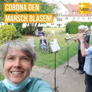 “Osterandacht vor der Tür des Altenwohnheims. Unterstützt durch die Trompeten, sende ich den Segen zu den Menschen hinter den Fenstern.