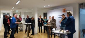 Tobias Kirchof, stellvertretender Direktor der Evangelischen Arbeitsstelle für missionarische Kirchenentwicklung und diakonische Profilbildung (midi) begrüßte im Namen des ganzen midi-Teams die neuen Nachbarn sehr herzlich. Auch einige Kolleg:innen aus dem Haus waren mit dabei, unter anderem die Partner:innen von midi und vom Archiv. Die Vorständin Sozialpolitik der Diakonie Deutschland, Maria Loheide, begrüßte die VEDD-Vertreter:innen ebenfalls herzlich.