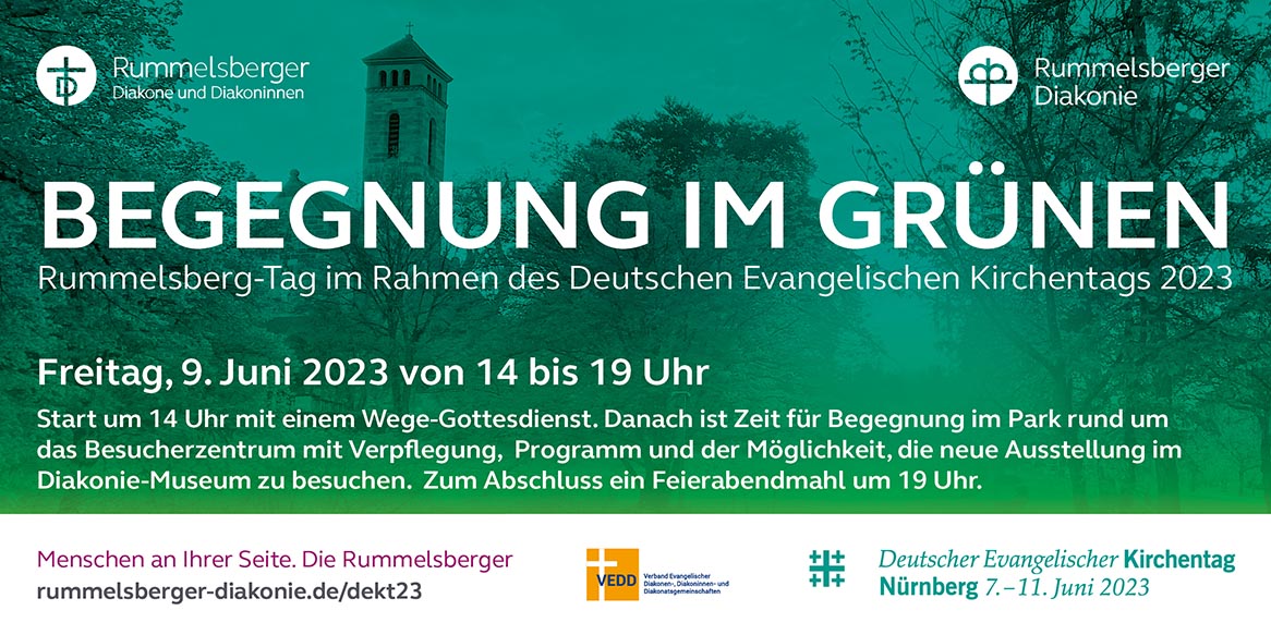 Am 9. Juni laden der Verband evangelischer Diakonen-, Diakoninnen- und Diakonatsgemeinschaften (VEDD), die beiden Rummelsberger Gemeinschaften und die Rummelsberger Diakonie zu einem „Begegnungstag im Grünen“ im Rahmen des Evangelischen Kirchentags ein. Um 14 Uhr geht es mit einem Wegegottesdienst los (Treffpunkt: Besucherzentrum, Rummelsberg 45, 90592 Schwarzenbruck) unter dem Motto „Es ist Zeit, den Weg der Barmherzigkeit zu gehen“ – die Sieben Werke der Barmherzigkeit, das Herzstück des Rummelsberger Altarbildes, stehen im Mittelpunkt des Gottesdienstes. Im Anschluss ist Zeit und Raum für Begegnung rund um das Besucherzentrum: (Alkoholfreie) Cocktailbar, leckere Verpflegung, ein kleines Programm und die Möglichkeit, das Diakoniemuseum zu besuchen. Der Nachmittag endet um 19 Uhr mit einem Feierabendmahl, das der VEDD in Kooperation mit den Rummelsberg Gemeinschaften und der Diakoneo-Gemeinschaft ausrichtet. (Ort: Philippuskirche, Rummelsberg 1).