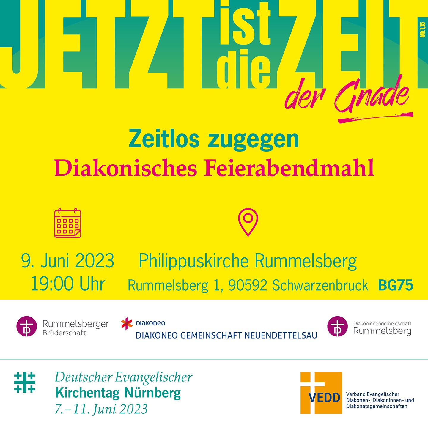 Der VEDD, die beiden Rummelsberger Gemeinschaften und die Diakoneo-Gemeinschaft laden im Rahmen des Begegnungstages in Rummelsberg während des Deutschen Evangelischen Kirchentages zu einem Feierabendmahl in die Philippuskirche ein.