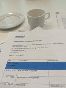 Vergangenen Mittwoch tagte die Sitzung „Verbände im Diakonat“ der Evangelischen Kirche Deutschland (EKD). Mit dabei Kolleg:innen des Kaiserswerther Verbandes, des Zehlendorfer Diakonievereins und des Verbands evangelischer Diakonen-, Diakoninnen- und Diakonatsgemeinschaften in Deutschland e.V.. Als Referent tauschte sich Walter Lechner, Referent für Sozialraumorientierung in Diakonie und Kirche bei midi, mit den Gästen über das Thema „Sozialraumorientierung“ aus. Auch das Thema „Diakonische Orientierung von Unternehmen“ stand im Blickpunkt der Tagung. „Auch wenn die Sitzung nur einen Tag dauert und ich dafür einen wirklich langen Anreiseweg in Kauf nehme, fahre ich gern hin, denn das ist eine echte Quelle für meine Arbeit und für mein Leben”, so Diakonin Heike Gatzke, Vorstandsvorsitzende des VEDD, die gemeinsam mit Geschäftsführer Diakon Tobias Petzoldt den VEDD bei der Sitzung vertrat. Von der EKD war Oberkirchenrat Steffen Merle, Referent für Sozial- und Gesellschaftspolitik, sowie Militärpfarrer Sigurd Rink dabei.