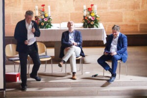 Nach einer halben Stunde, in der die Diakon:innen in Kleingruppen über verschiedene Fragen zu Berufsbild und die Weiterentwicklung dieses Berufsbilds diskutierten, kamen Tobias Petzoldt und Oberkirchenrat Stefan Reimers zu einer Diskussionsrunde auf der Bühne zusammen. Diakon Peter Dienst, der zweite Referent für Personalentwicklung und Fortbildung in den ersten Dienstjahren, moderierte das Gespräch. „Es muss sich viel ändern, wenn die Kirche eine diakonische werden möchte“, fasste Stefan Reimers zusammen. Denn die Kluft, die vor Ort zwischen den Diakonischen Werken und den Dekanaten und Ortsgemeinden herrsche, sei vielerorts noch breit. Die Wichtigkeit der Überwindung dieser Kluft betonte Tobias Petzoldt. „Überall dort, wo die diakonischen Handlungsfeldern unmittelbar mit dem eigenen Sozialraum zu tun haben, werden sie sehr positiv wahrgenommen“, bezog er sich auf die 6. Kirchenmitgliedschaftsuntersuchung (KMU) der EKD. Für Stefan Reimers war eines klar: Nur im Netzwerk kann die Arbeit gelingen, die für die Menschen im Sozialraum notwendig ist. Dabei war es ihm besonders wichtig, zu betonen: „Wir unterscheiden hier nicht mehr zwischen Menschen, die Hilfe benötigen und Menschen, die Hilfe geben – wir alle sind immer wieder beides.“